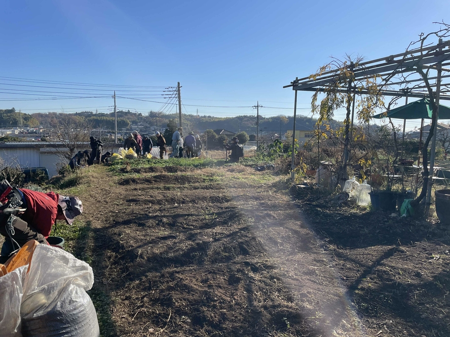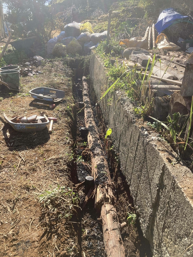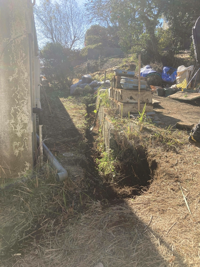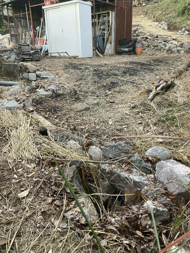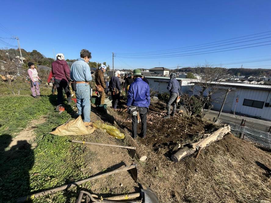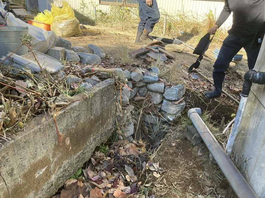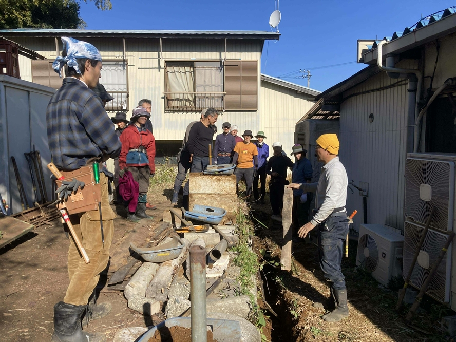 今回は、里山下にある民家周りの浸透改善のレクチャー。雨の日に水が溜まり、流れてしまう場所の改善造作を行いました。