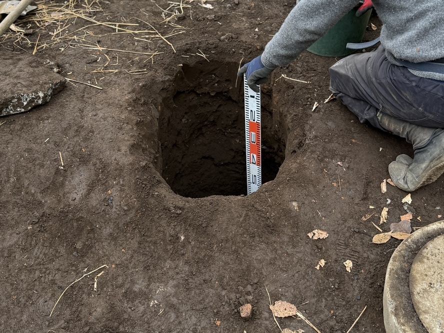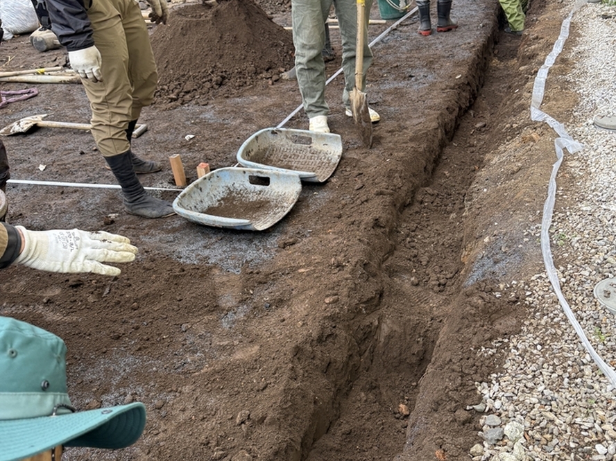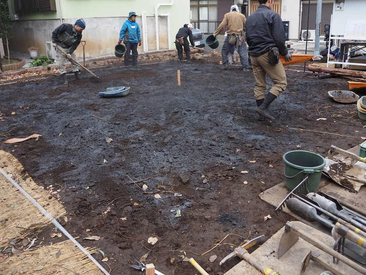 | 4 | 作業で発生した残土の処置 | 柱状改良で再び掘り返される場所でもあるので、簡易的な盛土処置をする。溝をほり、炭・くんたんと土を層状に盛りながら、できるだけ雨で土がぬかるまないように敷き均す。 |