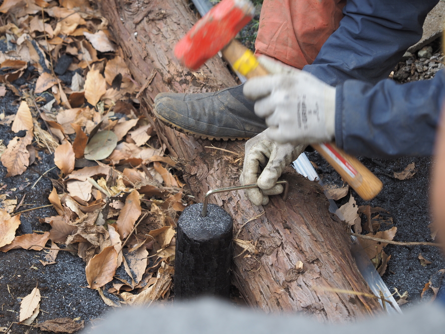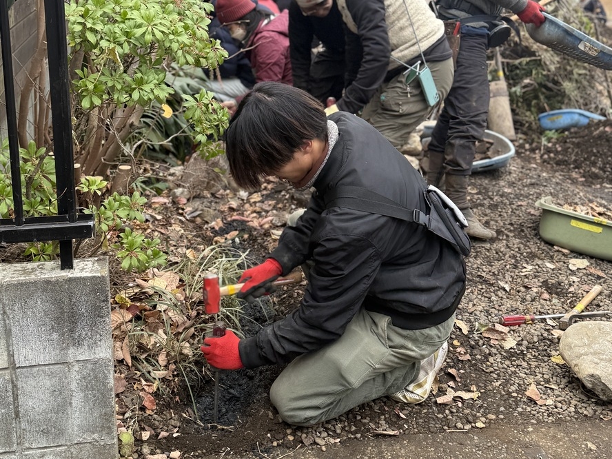 △ 手ぐわで溝を切り、固く締まった層を貫通させるよう浸透誘導杭を打っていく。手ぐわの使い方、通気浸透を高めるグリグリ棒の使い方もレクチャー受けながら作業を実施。