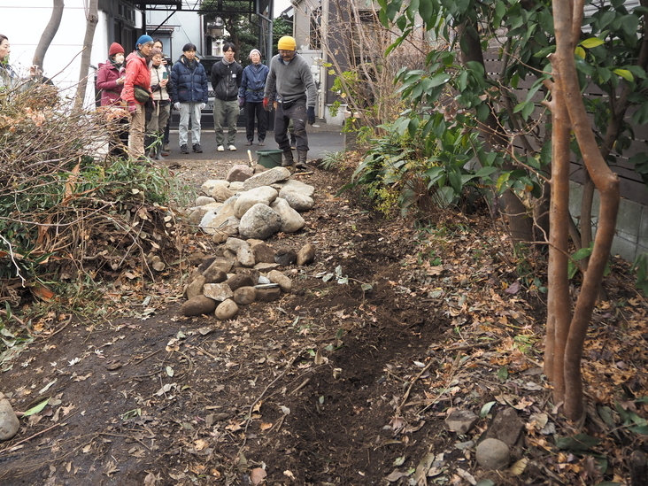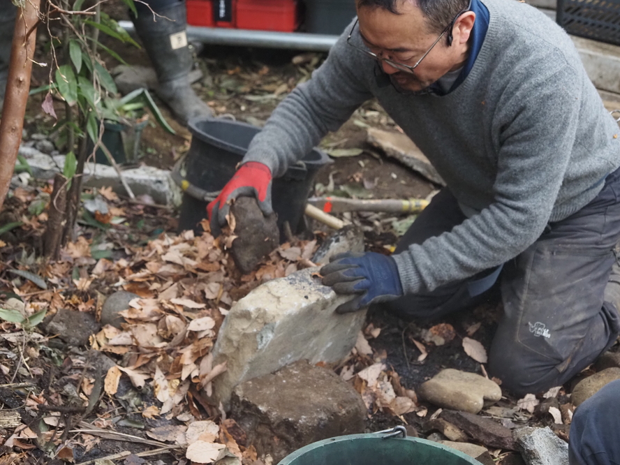 △ 浸透誘導杭を深く打ち込み、落ち葉や瓦を敷きながら、石を据えていく。美しく、かつ浸透効果のある石の置き方のレクチャーも。