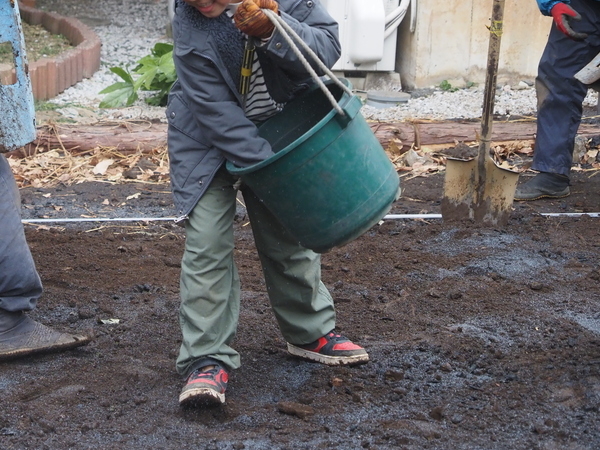 建物の建つ場所に、今回の施工で発生した残土を盛っていきます。来年の地盤改良や基礎工事で再び掘り返される場所なので、溝を掘り、炭・くんたんを撒いて、その時までぬかるまないように、簡易的な処置としています。