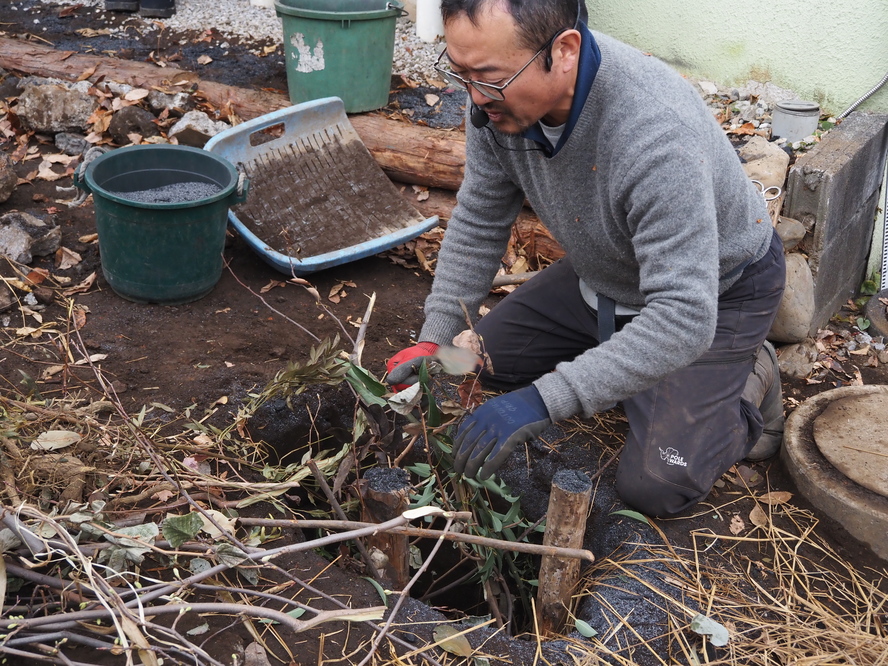 敷地の低い場所に集水する場所をつくります。藁・剪定枝・炭・くんたんを使った簡易的で、かつ効果的な方法を学んでいきました。