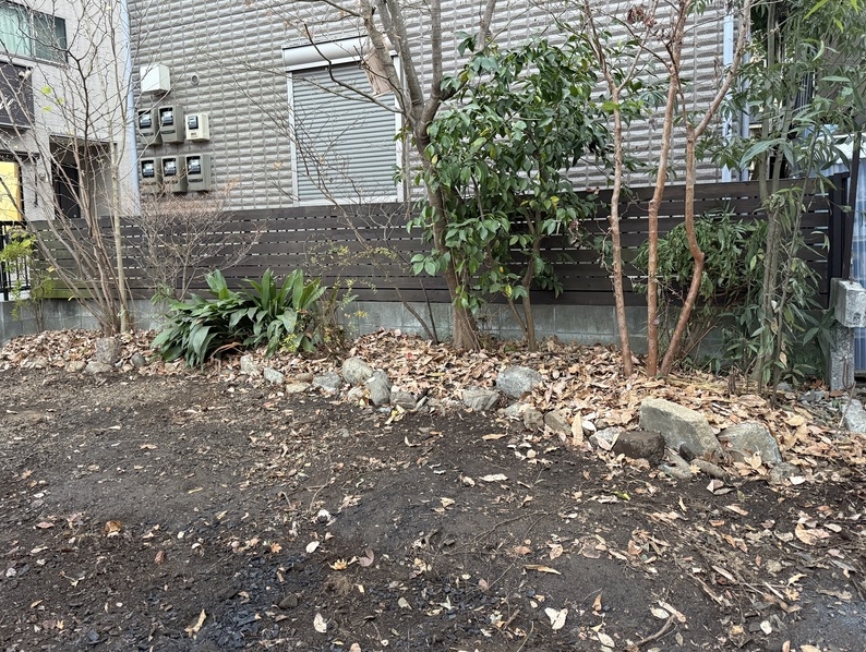 | 1 | 敷地境界の浸透処置・土留めづくり | 浸透機能を持たせる溝を兼ねながら、15cmほど敷地を嵩上げすることを想定した土留めをつくる。まずは工事が始まると作業が難しくなる隣地側から着手。 |