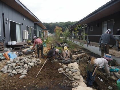 現在、有機土木協会が施工協力を行う「那須まちづくり広場」(※2)(那須まちづくり株式会社・栃木県那須町)に、石坂産業が再生した瓦や砕石などのリサイクル資材を供給し、地盤改良剤や締め固めによって硬化した土地の滞水改善施工が進行中です。これまで自然石、コンクリートガラを用いて、水溜まりやぬかるみが出来やすかった敷地内に、暗渠(あんきょ)や雨落ちなど雨水が土中に浸透し、土地で涵養(かんよう)される環境をつくることで、土中環境が改善され、人間だけでなく、植物をはじめとした多様な生きものが健康に生きられるようになります。