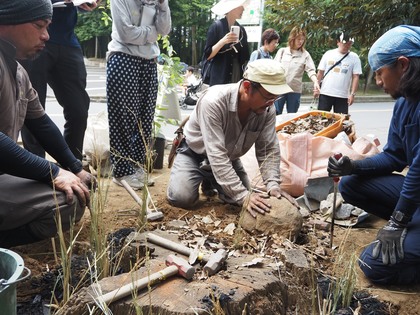 資源が完全循環する社会を目指す埼玉県内の産廃会社、石坂産業の担当者たちと 大量に必要になる石材は、石坂産業に持ち込まれた廃材を提供いただき、活かしてゆく | カチコチの大地の再生のために、枯れていった大木の根元を生かしてゆく 死して終わらず、死して再び次の生の礎となる。そうして生は未来につながる |