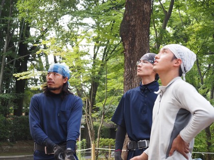 全長2キロに及ぶ参道緑地が市街地にあってなお残ること、それ自体が奇跡 しかしながら、周囲の環境変化とともに木々は衰弱し、そして次世代の後継樹木の芽吹きも今はない これを、次世代に続く杜の環境へと再生してゆくことが現代に生きる我々に課せられたこと | このプロジェクトの仕掛け人、鈴木圭介氏率いる株式会社soilの若衆と、高田造園のホープ、大介 次世代を開く若者たち、いい目してるな |