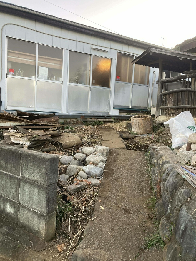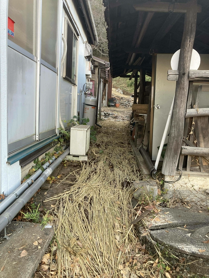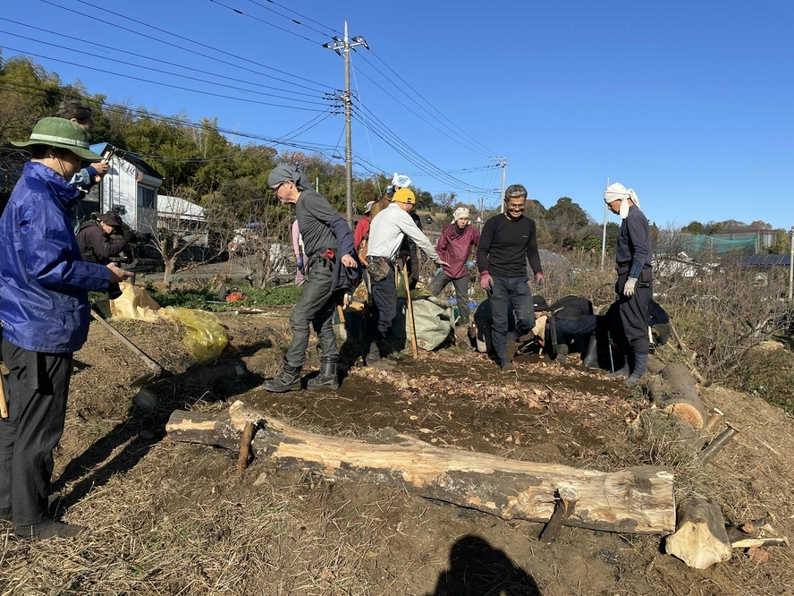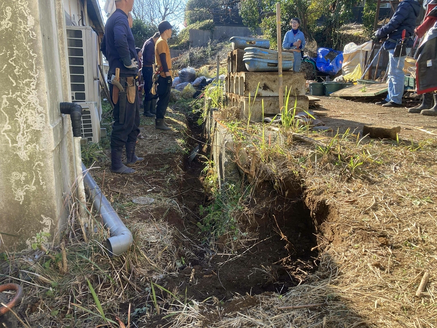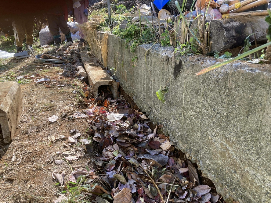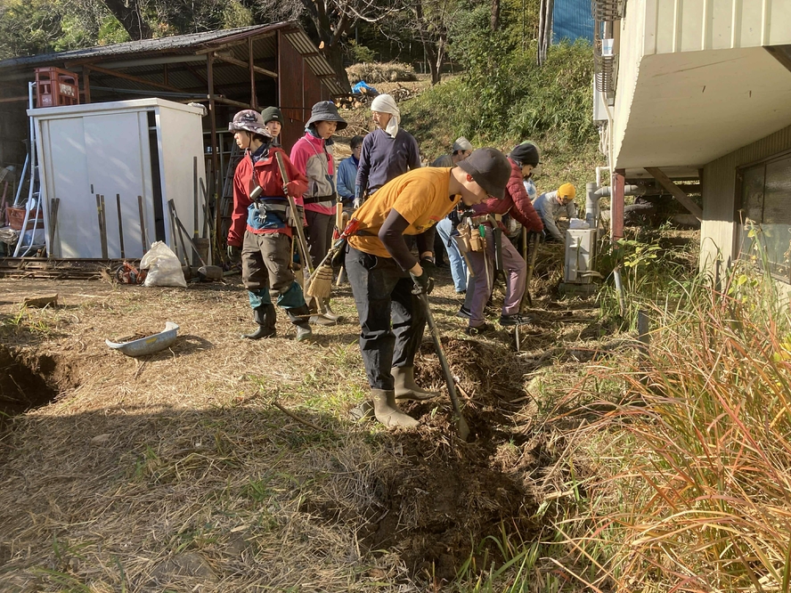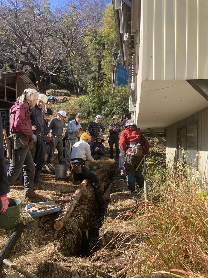 今回は、里山下にある民家周りの浸透改善のレクチャー。雨の日に水が溜まり、流れてしまう場所の改善造作を行いました。
