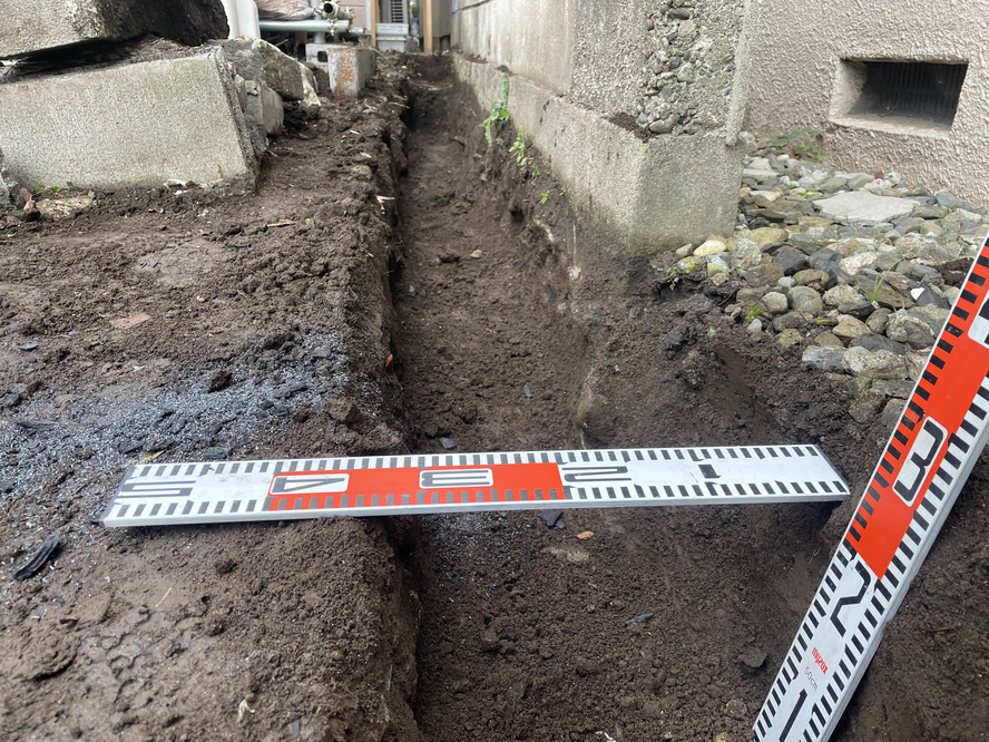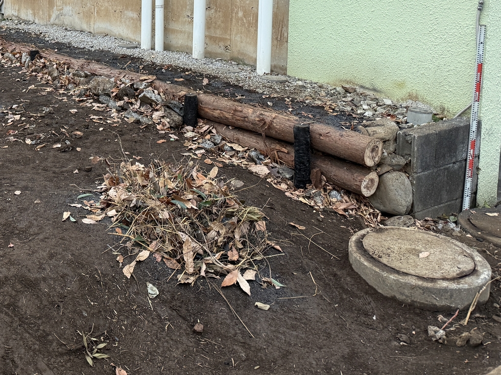 | 1 | 敷地境界の浸透処置・土留めづくり | 浸透機能を持たせる溝を兼ねながら、15cmほど敷地を嵩上げすることを想定した土留めをつくる。まずは工事が始まると作業が難しくなる隣地側から着手。 |