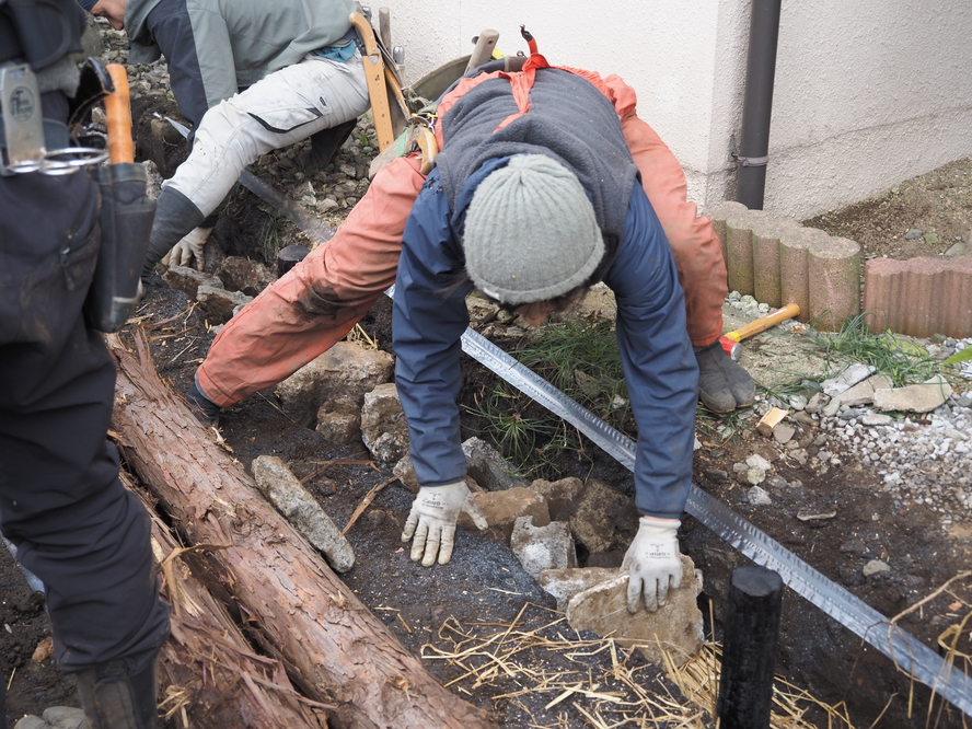 △ 浸透誘導杭を深く打ち込み、落ち葉や瓦を敷きながら、石を据えていく。美しく、かつ浸透効果のある石の置き方のレクチャーも。