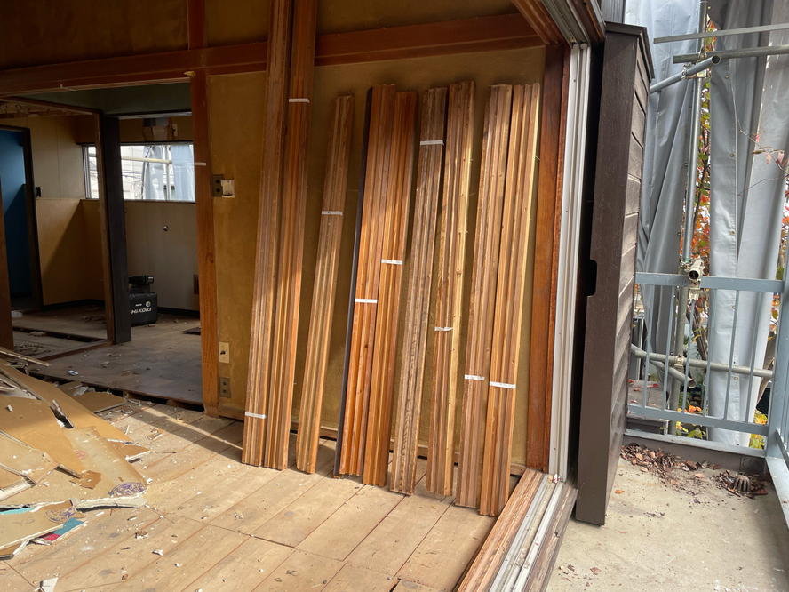 設計が進み、建物の解体フェーズを迎えると、新しい家で活かせそうなもの(建具、敷居・鴨居、柱、トイレの便器、洗面器、照明器具、タタミ、造作家具、、等々)はご夫婦や子どもたちと共に解体前から搬出し、保管していきました。アルミ製のバルコニーなども丁寧に解体し、子ども達と回収業者やリサイクルセンターに売りに行き、ちょっとしたお小遣いにもなりました。