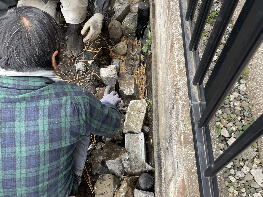 私たちはこれまで9件ほど土中を意識した庭づくりに携わってきたこともあり、ここでの庭づくりも当然、それを前提にしていたので、建物の取り壊し段階では解体業者の協力を得ながら、基礎のコンクリートやブロック塀・土中の石・伐採した枝葉も、後に資材として再利用できるように保管をしていました。