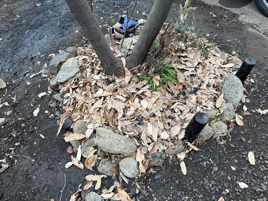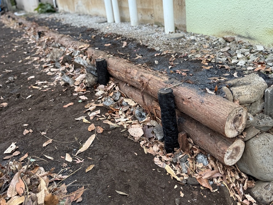 △ 作業後の様子。一部杭が見えたままになっているのは、工事車両が植栽帯に乗り込み過ぎないよう、目印としてあえて残した。