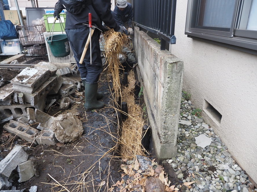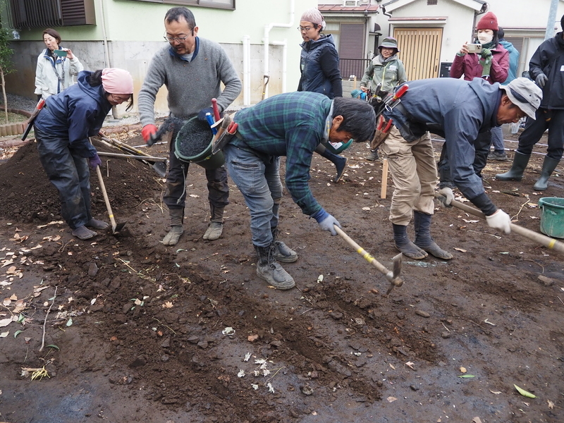 | 4 | 作業で発生した残土の処置 | 柱状改良で再び掘り返される場所でもあるので、簡易的な盛土処置をする。溝をほり、炭・くんたんと土を層状に盛りながら、できるだけ雨で土がぬかるまないように敷き均す。 |